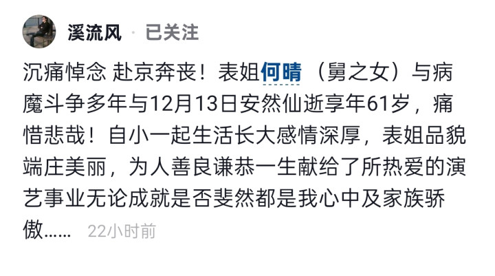 然后便是一些从未露过面的远房亲戚,昨天还有一个自称是何晴表弟的网友晒出去北京奔丧的视频,但细节均未清爽。