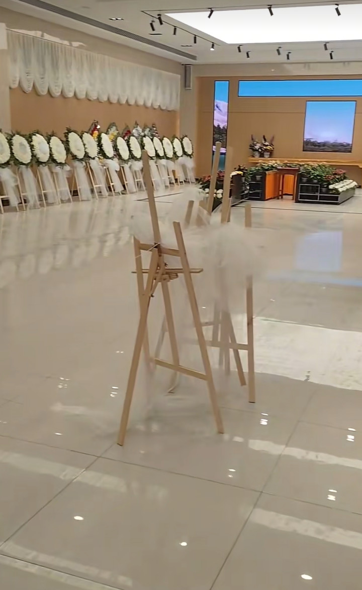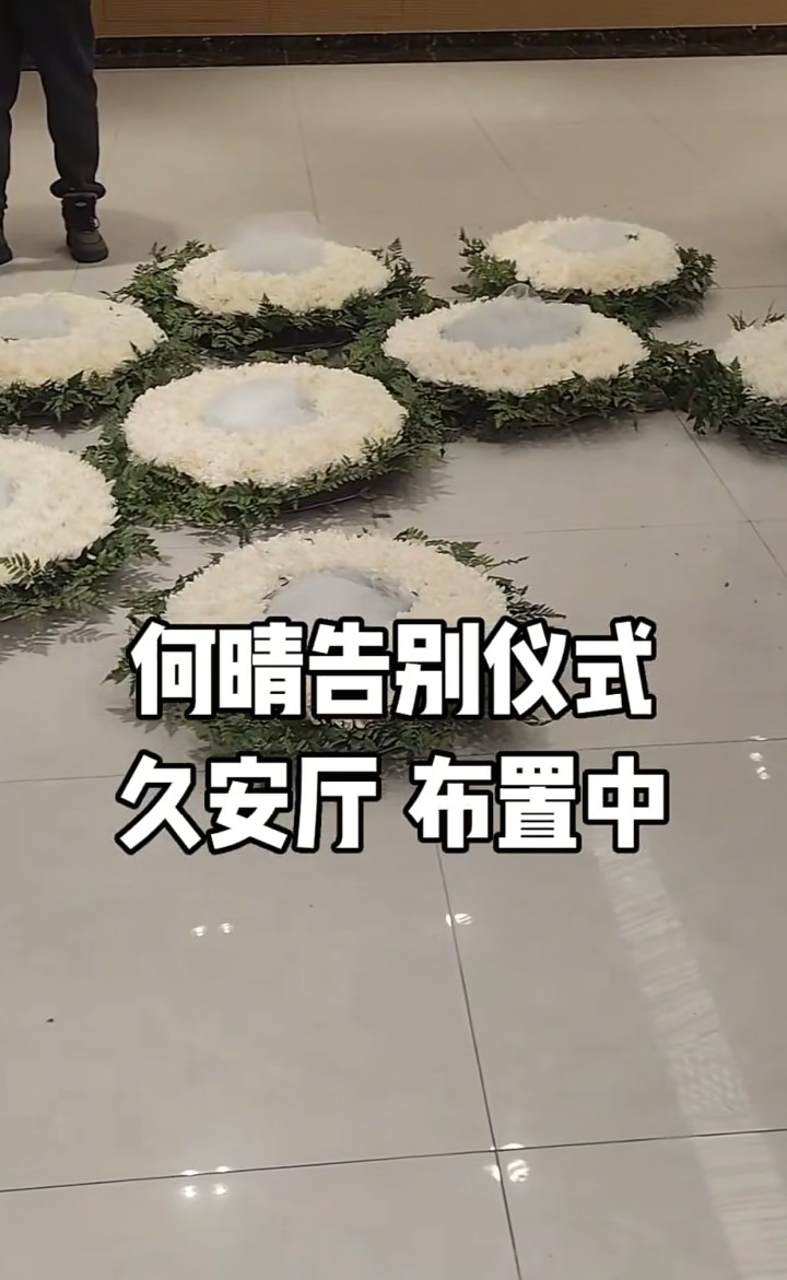 几个责任主谈主员在灵堂里拼装花圈,并未看到何晴的家属,虽然也有可能是人人不彊项何晴的家属。